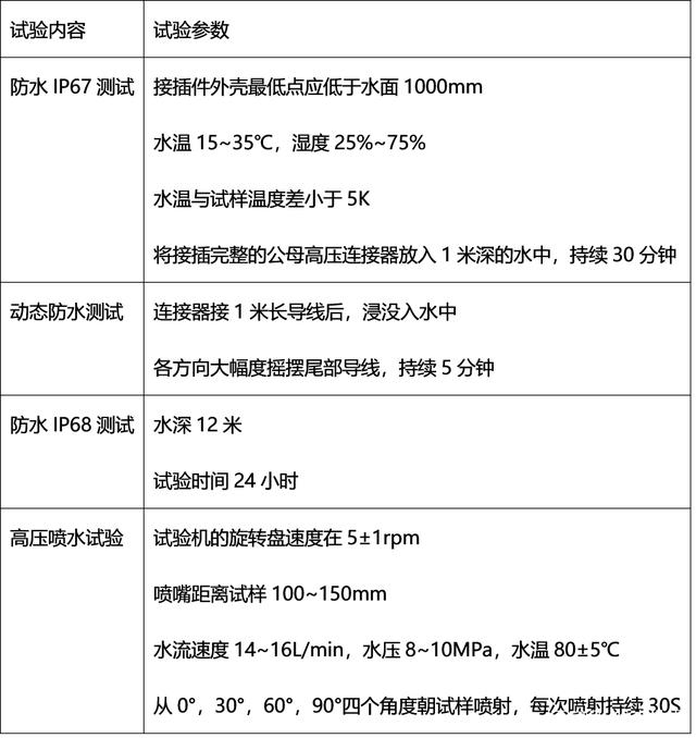 防水密封试验的目的是测试高压连接器的密封性能。采用冷热冲击试验机,对接插完整的公母高压连接器进行水密试验和高压喷水试验。